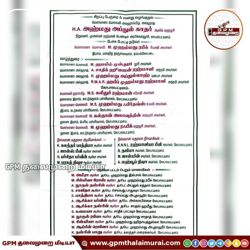 கோபாலப்பட்டினத்தில் ரஹ்மானிய்யா நூருல் அய்ன் பெண்கள் மதரஸா 27வது ஆலிமா பட்டமளிப்பு விழா மற்றும் குர்ஆன் மதரஸா ஆண்டு விழா!