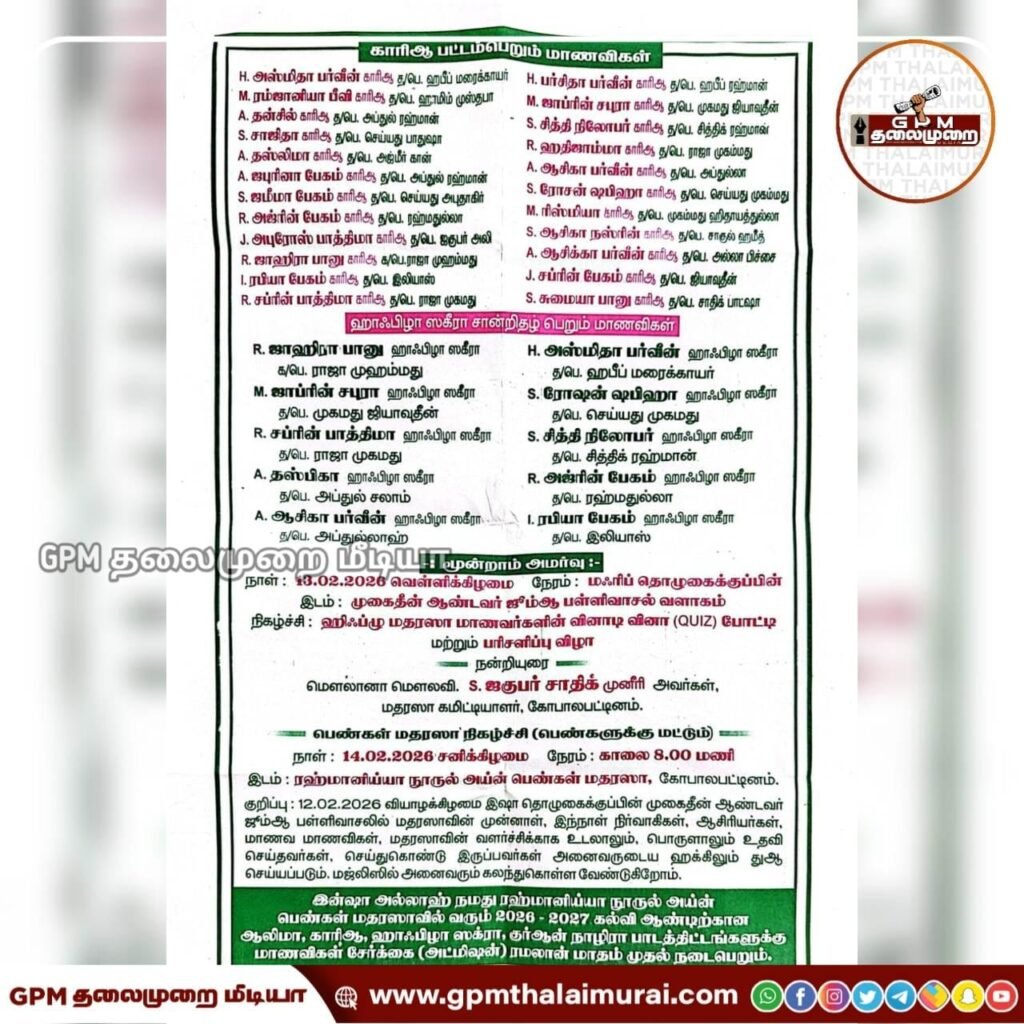 ரஹ்மானிய்யா நூருல் அய்ன் பெண்கள் மதரஸாவில் 2026-2027 கல்வி ஆண்டிற்கான ஆலிமா, காரிஆ, ஹாஃபிழா ஸகீரா மற்றும் குர்ஆன் நாழிரா ஆகிய பாடத்திட்டங்களுக்கு ரமலான் மாதம் முதல் புதிய மாணவியர் சேர்க்கை (Admission) தொடங்கும் என அறிவிக்கப்பட்டுள்ளது.