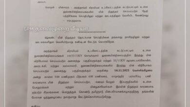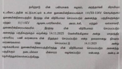 புதுக்கோட்டை மாவட்டம் கொடிக்குளம், ஆவுடையார்கோவில், அமரடக்கி, நாகுடி மற்றும் வல்லவாரி ஆகிய துணை மின் நிலையங்களில் நாளை 12.12.25 வெள்ளிக்கிழமை பராமரிப்பு பணிகள் மேற்கொள்ளப்படுகிறது. மேற்கண்ட துணை…